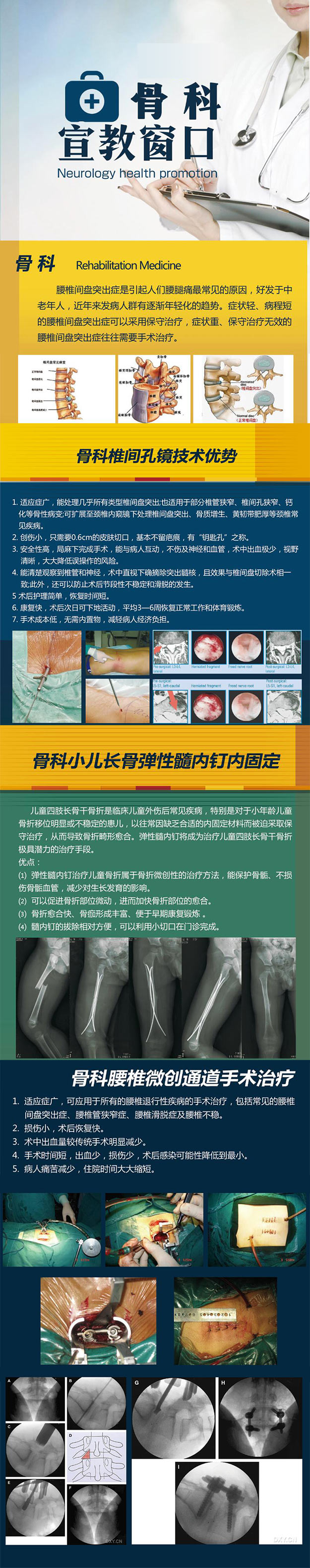 目前脊柱外科常规开展的业务包含脊柱退行性病(腰椎间盘突出、腰椎滑脱、椎管狭窄)、脊柱骨盆肿瘤根治术、颈椎椎间盘前路手术、颈椎、上胸椎椎弓根螺钉固定术、脊柱侧弯矫形术等常规手术,近年来广泛应用数字骨科技术开展脊柱微创化,微创椎间孔镜治疗腰椎间盘病患、经皮椎弓根螺钉内固定技术、经皮椎体成形术治疗脊柱疾病。