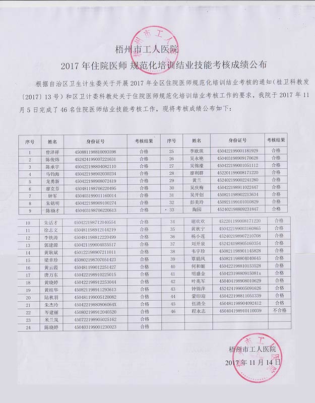 2017年住院医师规范化培训结业技能考核成绩公布