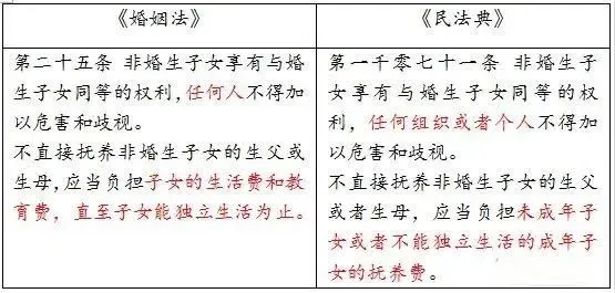 《民法典》第一千零七十一条将《婚姻法》修改从原本的“任何人”修改为“任何组织或者个人”,进一步明确了不得危害或者歧视的主体范围。在第二项中扩大了不直接抚养非婚生子女的生父或者生母应当负担抚养费的范围,包括未成年子女或者不能独立生活的成年子女,进一步保障了虽成年但不能独立生活的子女权益,比如脑瘫儿、残疾儿、因患病或意外等无法独立生活的非婚生子女等。
