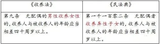 《民法典》第一千一百零二条将收养人与被收养人的四十周岁的年龄限制,从“男性收养女性”扩大到“收养异性子女”,即增加了“女性收养男性”的限制,其本质上增加了对男性未成年人的保护。