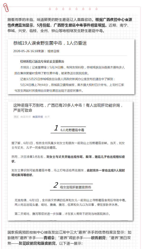 随着雨季的来临,味道鲜美的野生蘑菇让人蠢蠢欲动。根据广西疾控中心食源性疾病监测显示,5月份起,广西野生蘑菇中毒事件明显增加。