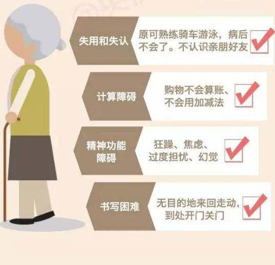 三、知晓阿尔茨海默病早期迹象。包括:很快忘掉刚刚发生的事情;完成原本熟悉的事务变得困难;对所处的时间、地点判断混乱;说话、书写困难;变得不爱社交,对原来的爱好失去兴趣;性格或行为出现变化,等等。