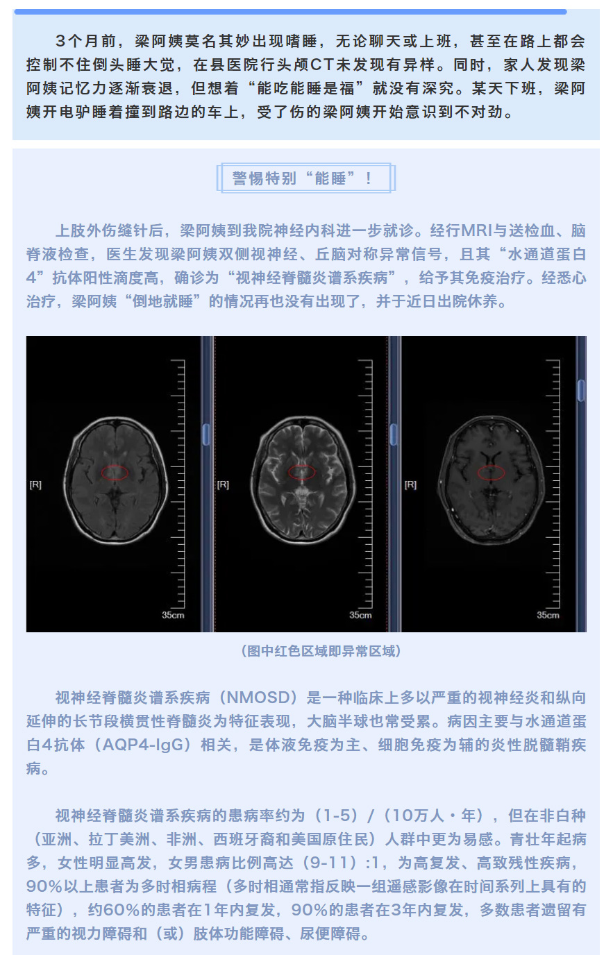 视神经脊髓炎谱系疾病(NMOSD)在临床上多以严重的视神经炎和纵向延伸的长节段横贯性脊髓炎为特征表现,大脑半球也常受累。