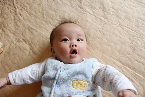 让宝宝躺在一块柔软的毛巾上,注视宝宝,边抚摸边和宝宝说话。抚触的时间最好安排在宝宝洗澡后、睡觉前或两次喂奶之间。