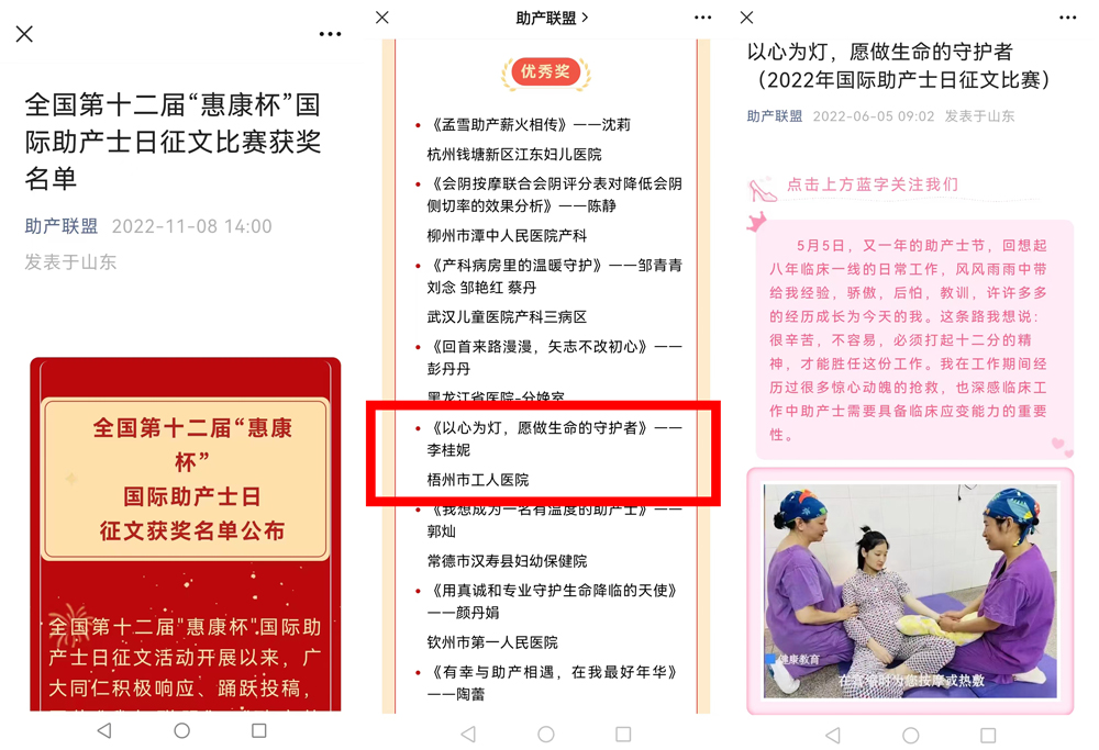 参赛选手李桂妮围绕“我与联盟”“助产故事”“分娩故事”“对助产专业发展提出建议和良策”“对助产人生的感悟和真实的生活感受”等活动要求,畅谈助产、创作了观点鲜明、内容丰富、文字优美的作品,展现了我院助产士勤学善思、知行合一的良好精神面貌,得到了评委组一致好评,在助产联盟公众号公示并在全国第十二届助产年会暨2022年助产技术与管理培训班上表彰。