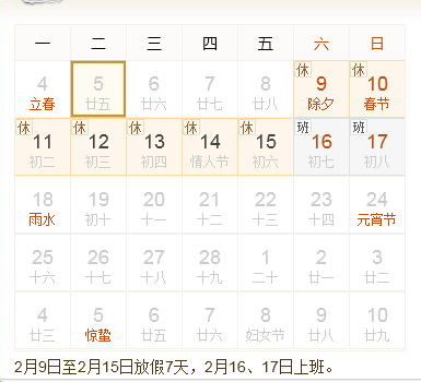 2月9日(除夕)至2月15日(年初六)放假。2月16、17上班。