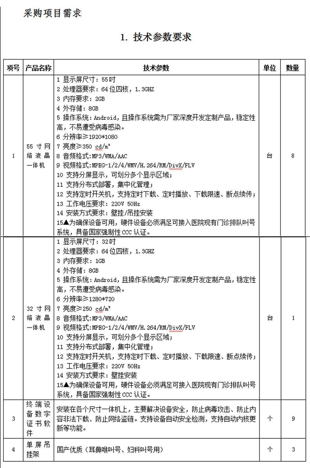 (一)、采购内容:叫号显示屏及辅材,预算86800元。