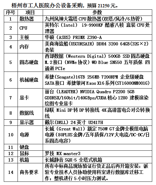 梧州市工人医院办公设备采购院内询价招标采购公告
