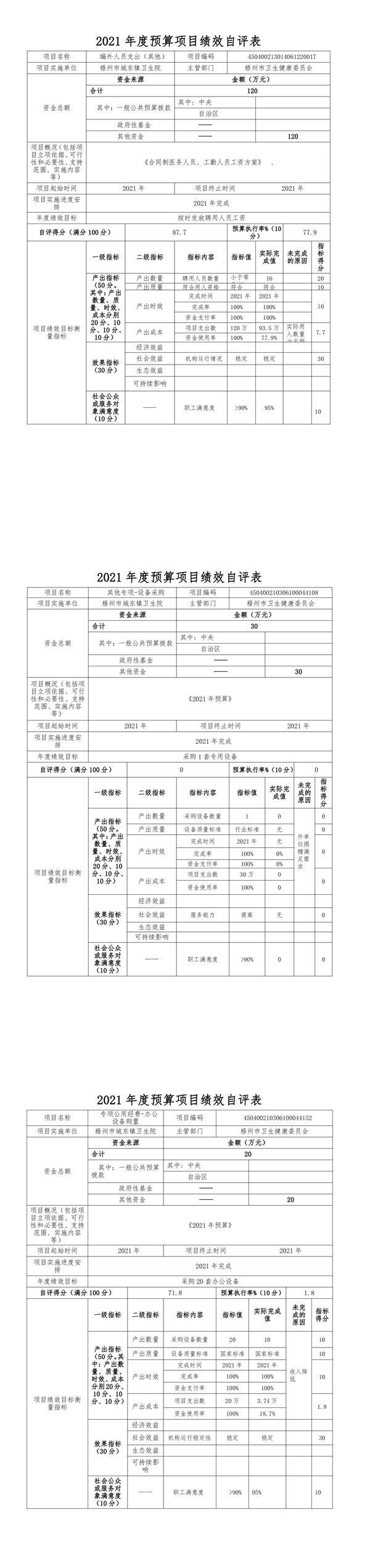单位其他运转类项目项目绩效自评综述:根据年初设定的绩效目标,编外人员支出(其他)项目自评得分为87.7分。发现的主要问题及原因:是本单位编外职工流动率大,实际用人数量少于预算。下一步改进措施:招聘高级医疗人才,开展本单位医疗业务,增人增资。其他专项-设备采购项目自评得分为0分。发现的主要问题及原因:本单位事业收入少,无自有资金购买设备,预备充足资金购买专用设备。下一步改进措施:开展医疗业务,增加事业收入。专项公用经费-办公设备购置项目自评得分为71.8分。 发现的主要问题及原因:本单位21年收入降低,无充裕资金购买办公设备。下一步改进措施:开展医疗业务,增加事业收入,预备充足资金购买办公设备。