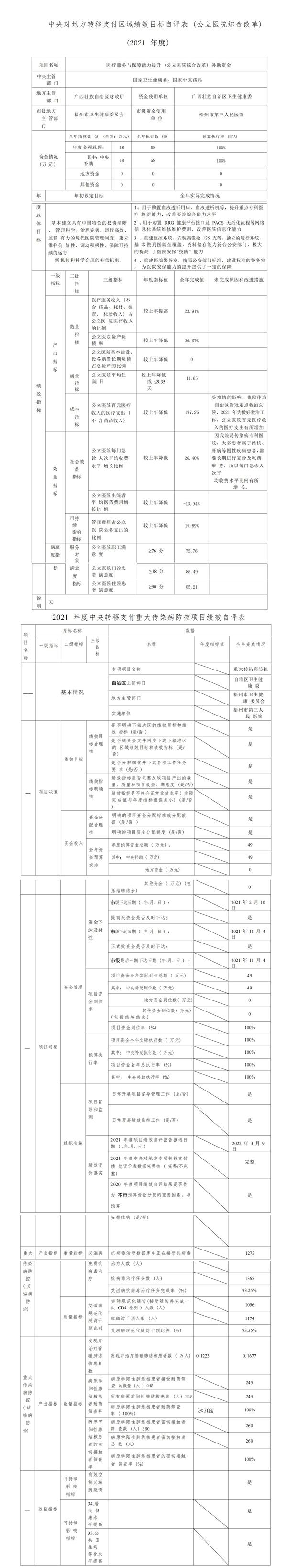 我单位今年在单位决算中反映中央财政医疗服务与保障能力提升项目及中央转移支付重大传染病防控项目自评结果。中央财政医疗服务与保障能力提升项目自评综述:根据年初设定的绩效目标,中央财政医疗服务与保障能力提升项目,项目自评得分为 80 分。发现的主要问题及原因:一是受疫情的影响,我院作为自治区新冠定点医院,2021年为做好救治工作,公立医院百元医疗收入的医疗支出 (不 含药品收入) 有所增加;二是因我院是传染病专科医院,大 多患者属于结核、肝病等慢性疾病患者,需要长期进行复诊 及吃药维持,所以每门急诊人次收费水平比例有所增长;三 是满意度偏低。下一步措施:一是加强对药品和耗材的采购、 使用管理,严格审核新增药品、新增卫材,规范医院采购、 物资储存的管理,从源头上控制药品和耗材的支出,降低药 品和耗材的支出;二是提高服务质量,完善患者就医环境及 就医服务,提高患者的满意水平;三是完善绩效考核体系, 激励担当作为,维护职工切身利益,提高职工对单位的归属感及满意度;中央转移支付重大传染病防控项目自评综述:根据年初设定的绩效目标,中央转移支付重大传染病防控项目,项目自评得分为 100 分。发现的主要问题 及原因:一是部分学科技术支持不足,如艾滋病肿瘤科、耳 鼻喉科、儿科、眼科、病理科仍是我们的薄弱环节;二是专 业技术人才数量不足、质量不高。科室医疗技术人员总体数 量不足、质量不高,服务水平较低,结核病及艾滋病患者诊疗人次数和住院人次数逐年上升,但卫生人才缺少的问题 依然突出。下一步措施:一是建议增加经费投入和学科技术 支持;二是完善相应激励办法及激励资金投入,鼓励艾滋病 一线人员通过提高工作量及工作质量来不断提高福利待遇, 鼓励引进人才,鼓励论文发表、科研成果、职称晋升,树立 榜样,弘扬先进,推广经验,鼓励重点学科人员多出研究及 业务成果;三是加强健康教育宣传力度