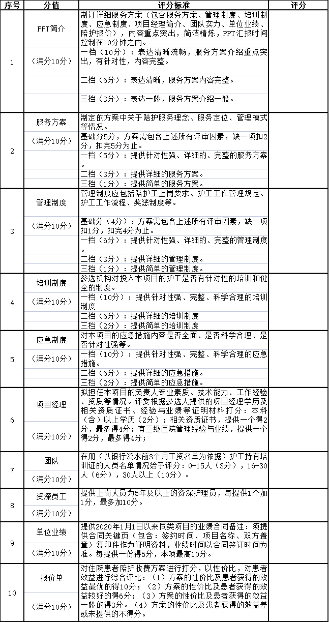 4.遴选供应商的确定:投标文件通过符合性审查,服务方案、管理制度、培训制度、应急制度、团队成员、单位业绩、陪护报价,服务承诺等方面择优遴选。