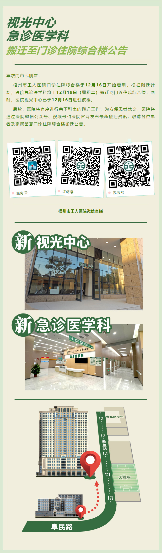 梧州市工人医院视光中心、急诊医学科搬迁至门诊住院综合楼公告