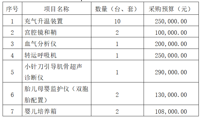 我院拟对充气升温装置、宫腔镜和鞘、血气分析仪、转运呼吸机、小针刀引导肌骨超声诊断仪、胎儿母婴监护仪(双胞胎配置)、婴儿培养箱进行市场调查,欢迎符合条件的生产厂家(代理公司)前来参加,现将有关事项公告如下: