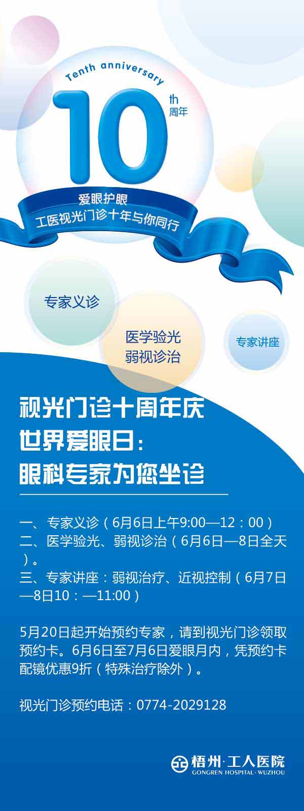 今年6月6日是世界爱眼日,主题是“关爱青少年眼健康”。届时我院专家麦丹、陆华文等眼科医生将进行眼病义诊、咨询活动;举行“弱视治疗”、“近视控制”知识讲座,欢迎市民前来咨询。