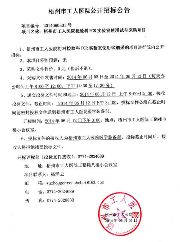 梧州市工人医院检验科PCR实验室使用试剂采购项目院内招标