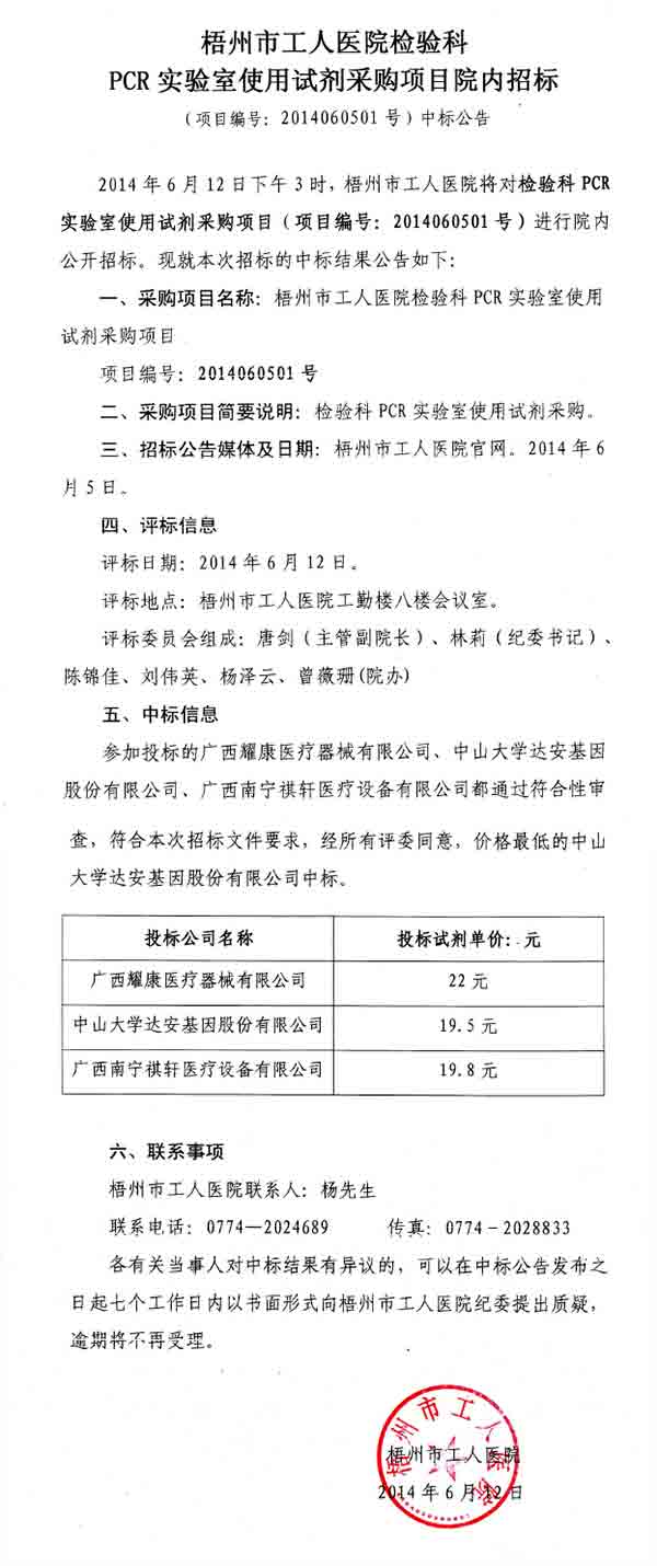 梧州市工人医院检验科PCR实验室使用试剂采购项目院内招标
