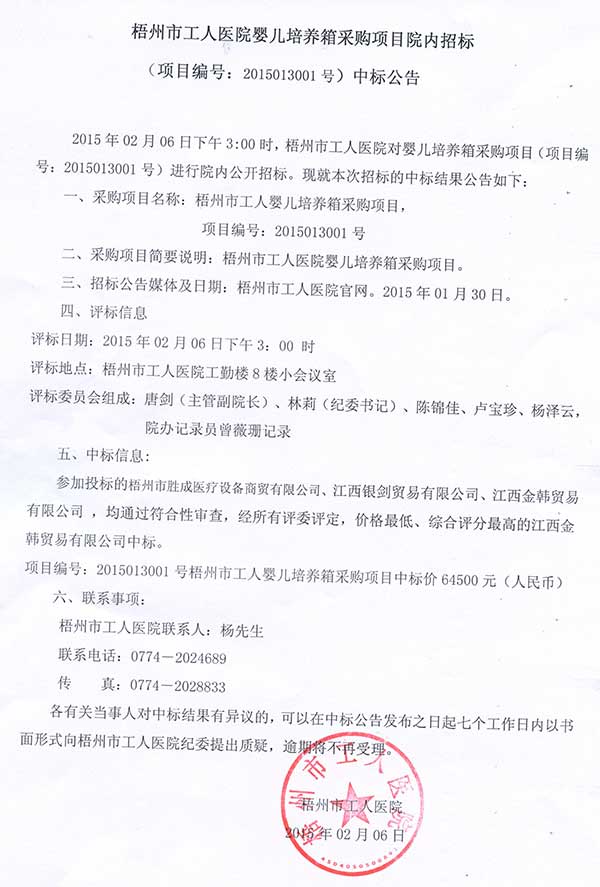 梧州市工人医院婴儿培养箱采购项目中标公告