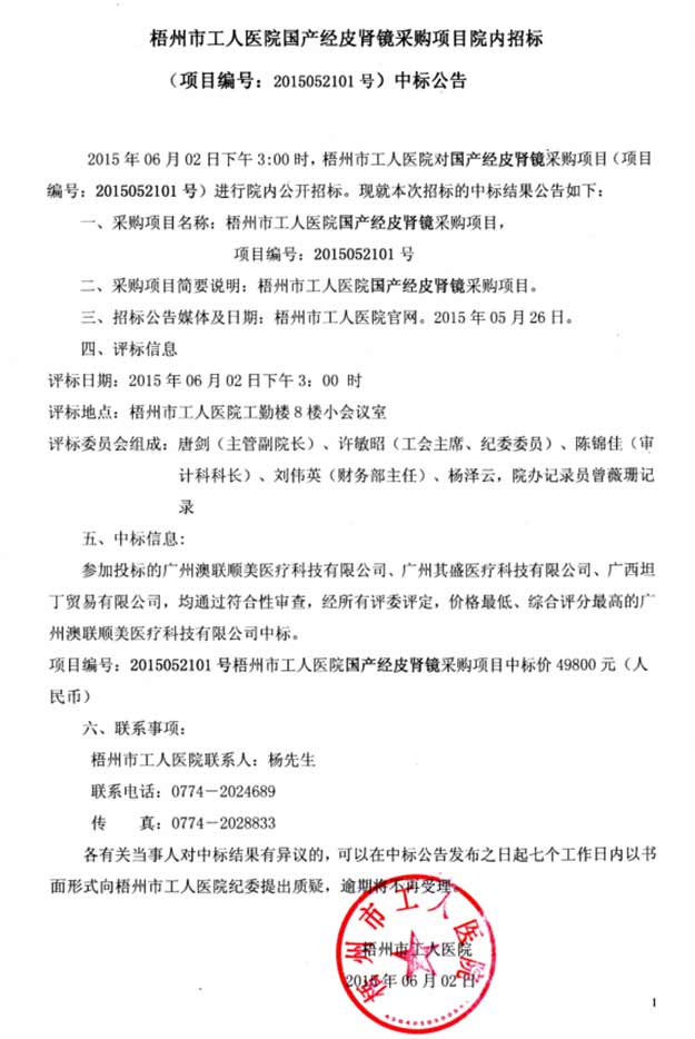 梧州市工人医院国产经皮肾镜采购项目院内招标中标公告