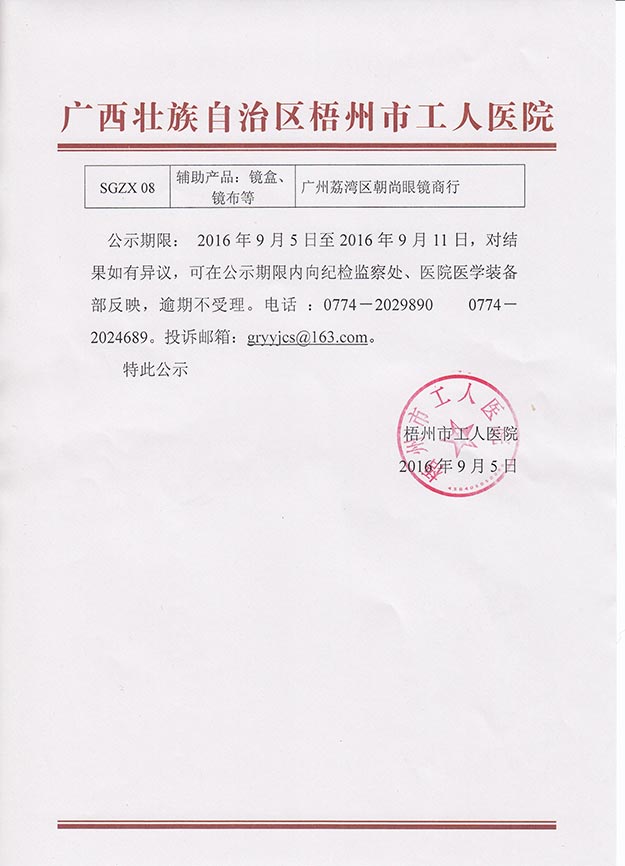 梧州市工人医院视光中心眼镜视光产品议价采购结果公示