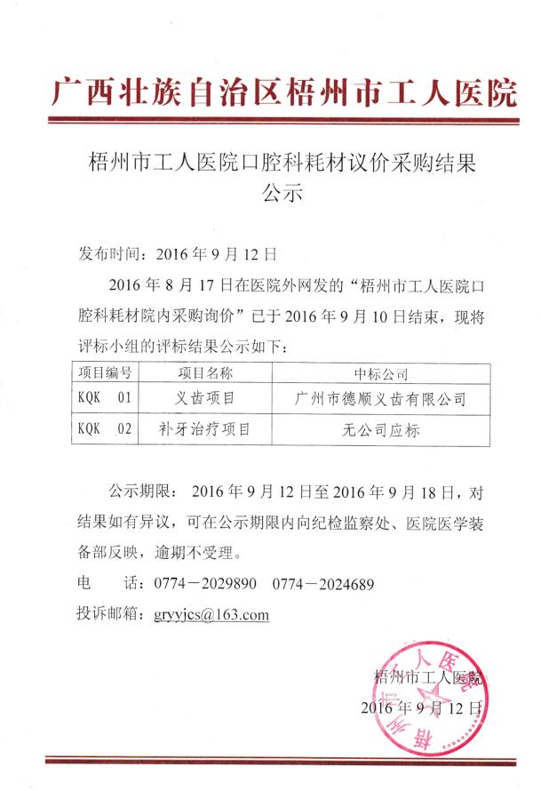 梧州市工人医院口腔科耗材议价采购结果公示