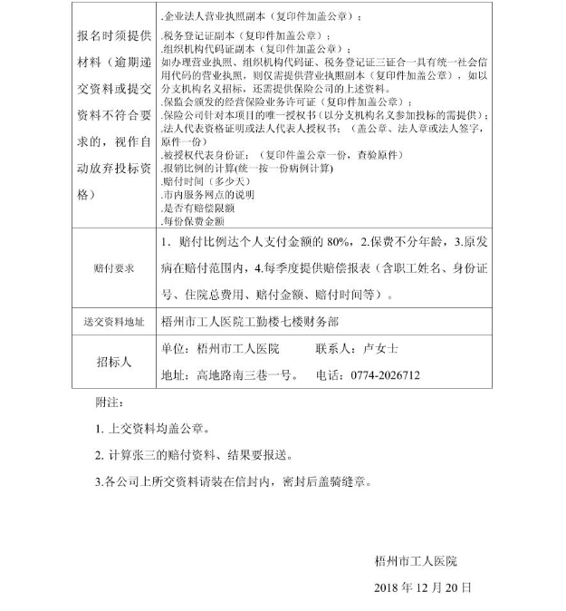 12.20 住院费用补偿团体医疗保险招标(院内议标)公告
