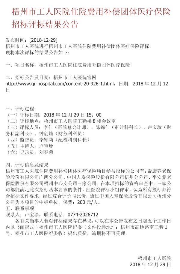 住院费用补偿团体医疗保险招标评标结果公告