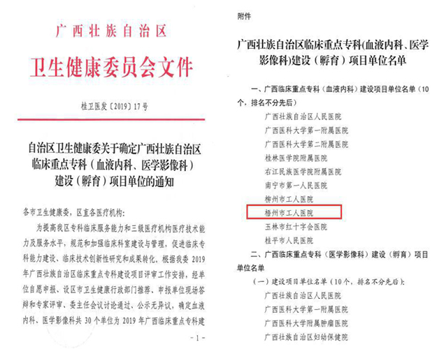 梧州市工人医院血液内科喜获广西临床重点专科建设项目