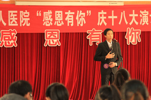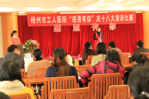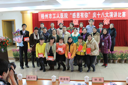 为庆祝党的十八大胜利召开,讴歌祖国建设辉煌成就,凝聚奋进力量,在医院党员干部职工中广泛开展廉洁从政、廉洁行医、诚信服务教育,近日,梧州市工人医院举行了“感恩有你”庆十八大演讲比赛。医院院长到场观看了比赛,书记周淑敏、纪委书记林莉、副院长高兴华等以评委身份出席活动。