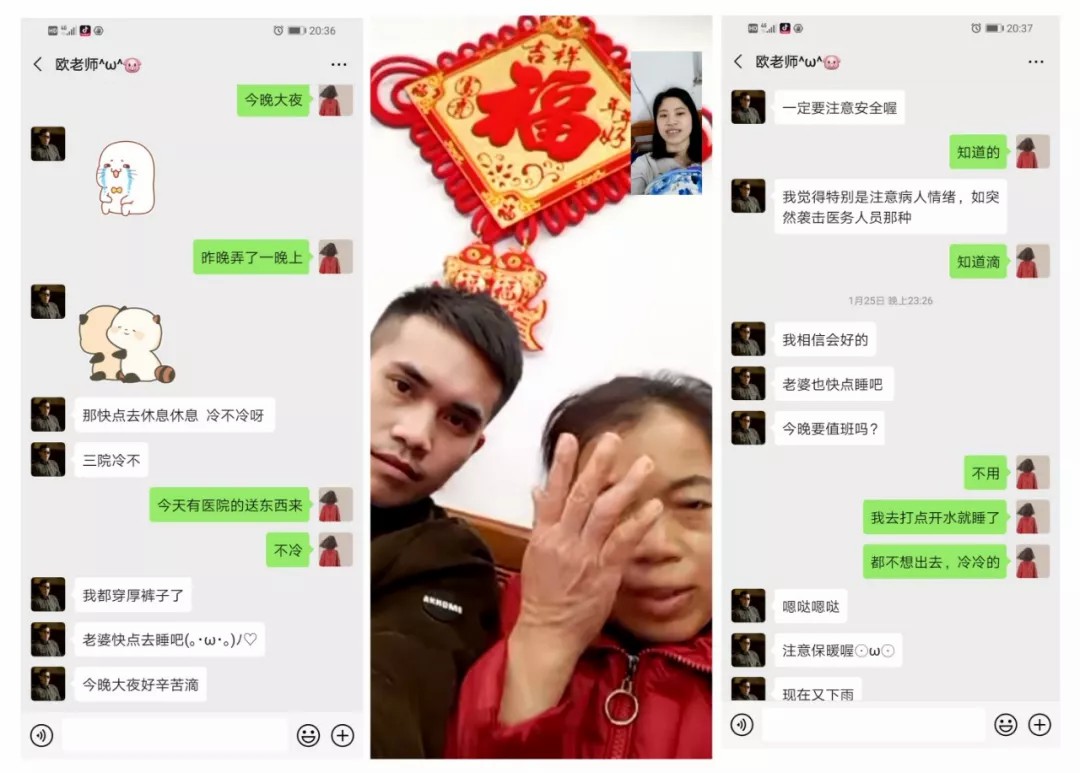 黄珊是一名共青团员,也是一名呼吸内科护士,曾荣获梧州市卫健系统、院级“优秀团员”称号。当丈夫欧先生和家人得知她决定奔赴抗疫一线的消息后表示十分担忧,但也能够理解她,并给予大力支持。大年初一,因忙碌于照顾病人、整理记录等,直到深夜23时,她才有空拿出手机和家人拜年。通过视频电话,黄珊终于见到了思念已久的家人,家里的关怀并与支持像一束阳光驱散了她的愧疚。因为分离所以更懂得团聚的可贵,以爱抗疫,胜利可期。