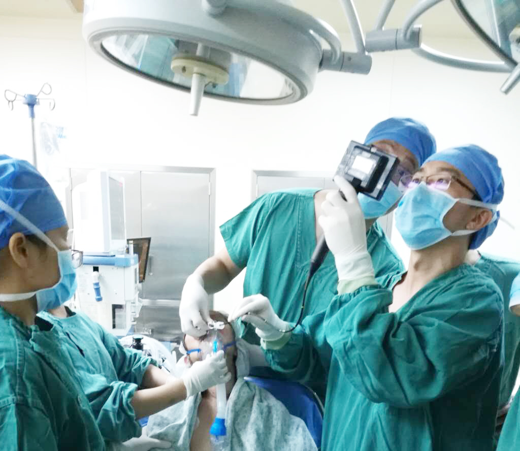 3月10日10:00,黄奶奶进入手术室。考虑到黄奶奶无法平躺,加之其随时可能出现呼吸困难,麻醉科主任石显江与手术麻醉团队决定采取半坐卧位清醒状态下施行气管插管以确保黄奶奶保持通气。在纤支镜的辅助下,陈龙副主任医师和黄祥伦副主任医师顺利为黄奶奶插入了气管导管,并在通气改善后迅速静脉注入麻醉药、改半坐卧为平卧位。