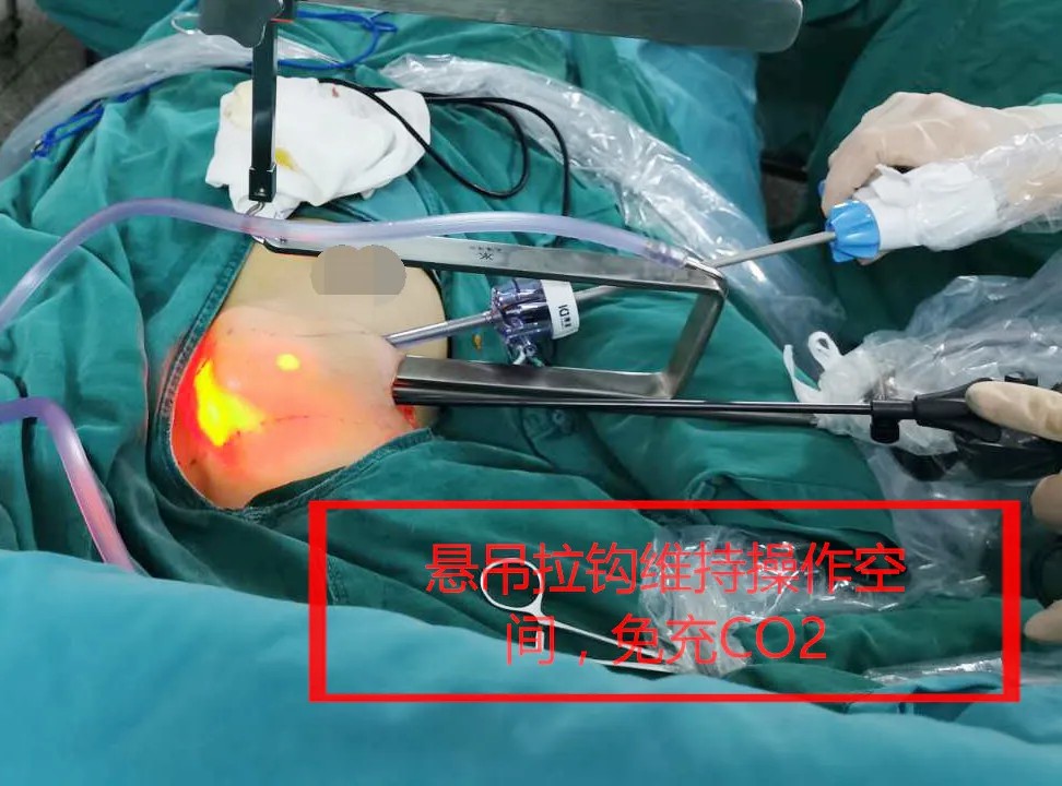 实际上,与传统开放手术相比,免充气腋窝入路腔镜甲状腺切除术是一项微创手术,主要在腋下顺着皮肤褶皱取切口并置入专用的悬吊拉钩维持操作空间,手术切口小且能隐藏于自然皱褶。另外,术中无需充入二氧化碳,避免高碳酸血症和气体栓塞,降低麻醉风险,减轻患者术后不适感,加快恢复速度。