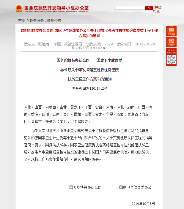 强直性脊柱炎是一种主要累及脊柱、外周关节、韧带、肌腱,以疼痛为主的慢性自身免疫疾病,可引起脊柱强直和纤维化,造成不同程度眼、肺、肌肉、骨骼病变,严重者将导致脊柱畸形和强直。为了对贫困中重度强直患者开展医疗救治,帮助患者减轻病痛,实现正常生活,摆脱贫困,2019年10月,国务院扶贫办综合司、国家卫生健康委办公厅联合印发了《强直性脊柱炎健康扶贫工程工作方案》(国开办司发〔2019〕12号),标志着强直健康扶贫工程面向全国832个贫困县正式实施。
