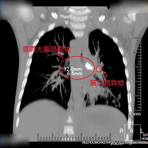 (左图为堵塞支气管的大直径异物,右图为左肺下叶小异物)