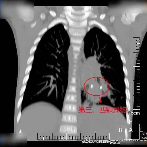 7月18日上午,小安父母带着小安来到我院儿科门诊就诊。查看小安的外院CT结果,医生发现小安虽无呼吸困难,但是其左肺主支气管有大块尖锐硬物且左肺内异物数量较多,属于复杂肺内异物。原来,2岁半的小安不小心被水泥推车翻盖,当时无不适症状,但随后两天内小安开始咳嗽、发热。由于小安肺内异物体积过大且外院无法进行取异物手术,特来我院求医。