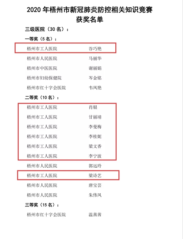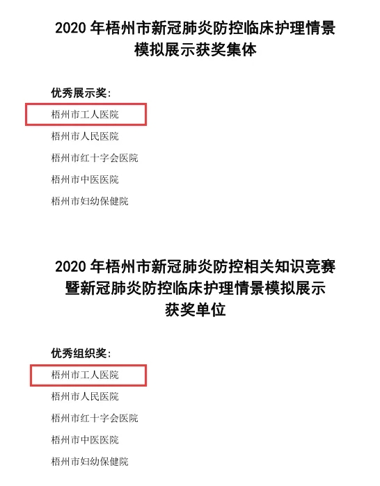 各赛项竞争激烈,我院选手们以饱满的热情和严谨的态度沉着应对,在激烈角逐中脱颖而出,荣获“2020年梧州市新冠肺炎防控临床护理情景模拟优秀展示奖”“2020年梧州市新冠肺炎防控相关知识竞赛暨新冠肺炎防控临床护理情景模拟展示优秀组织奖”,10名参赛选手均获得新冠肺炎防控相关知识竞赛名次,在全市各级医疗机构参赛者中名列前茅。