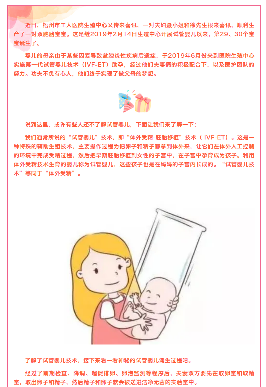 近日,梧州市工人医院生殖中心又传来喜讯,一对夫妇聂小姐和徐先生报来喜讯,顺利生产了一对双胞胎宝宝。