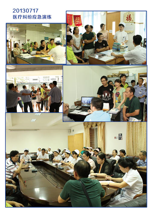 演练分科内解决、院内解决医疗纠纷中常见的场景,如:医务人员如何对投诉患者进行知情谈话和告知、如何应对家属要求查询费用、如何应对家属的无礼取闹、如何启动“三级医疗风险预案”、如何向家属介绍正确的投诉维权方式、安保人员如何在发生医疗纠纷时发挥作用、医院应急办公室如何报告等等。每个场景之间一环接一环,逐步把设定的每一个场景都自然连接,场面形象逼真,最后以成功处置纠纷收尾。演练结束后院领导对演练中存在的问题进行点评与分析总结,参演人员共同参与讨论。
