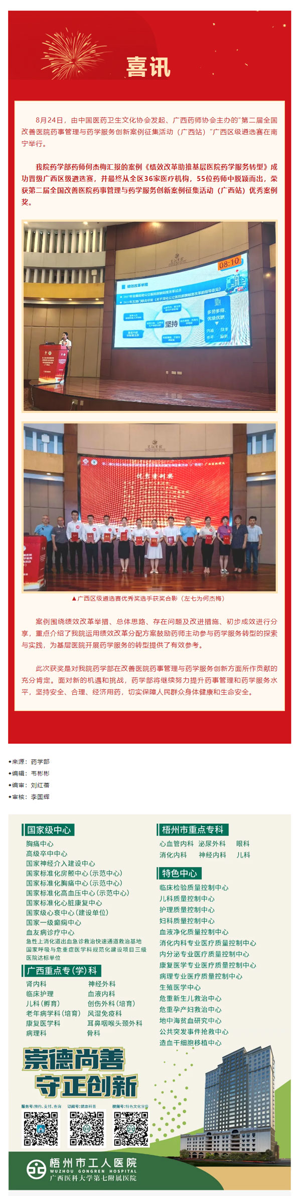 我院药学服务案例获第二届全国改善医院药事管理与药学服务创新案例征集活动(广西站)优秀案例奖
