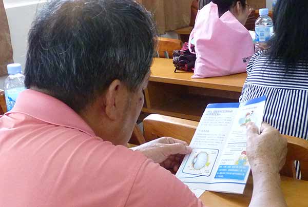青光眼俱乐部会员正在认真阅读青光眼知识手册