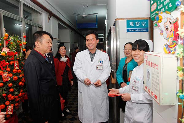 多年来,为让坚守岗位的医务人员过一个欢乐祥和的春节,院领导坚持每年在除夕夜走访各科室,为各科值班人员送去慰问品和新春美好的祝福,也为不能回家过年的患者送上新年祝福,让在值班的医务人员和患者都能感受到家一般的温暖和过节的浓厚气氛。