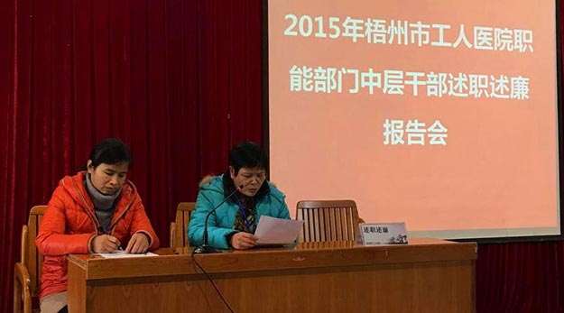 2月17日上午,工人医院19名职能部门中层干部集中会场,轮流对上年度工作情况进行述廉述职。医院领导班子、医疗科室负责人进行现场考评,院长点评,促进中层干部不断提高工作效率和服务能力,让群众更多感受到医院规范化管理所带来的好处。
