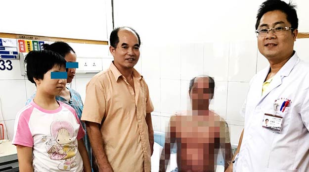 黎大叔出院时,家人和医生合照(由于黎大叔受伤太严重,我们进行了马赛克处理)