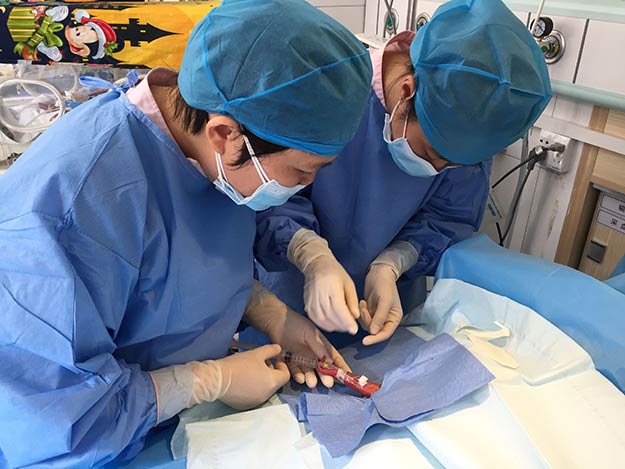 该患儿因为早产的缘故,体重仅有0.95公斤,各个器官功能发育尚未成熟,尤其肺部发育不成熟,造成呼吸反应差,生命体征不稳定,随时可能有生命危险,并需要长期肠外营养治疗,为了保护外周静脉,预防化学性静脉炎和药物渗漏性损伤,为了将各种治疗药物及营养及时输注到患儿体内,经过科室医护救治团队共同商讨后,决定为该患儿实施经外周静脉穿刺中心静脉置管(PICC置管)。