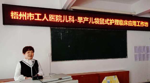 3月29日下午,我院新生儿护理专科小组在工勤楼四楼梯形教室召开以workshop形式进行的“袋鼠式临床护理应用”学术交流会。本次学术交流会由我院儿科护士长、新生儿护理专科小组组长卢露主持,共有60余名来自梧州市各级医院的儿科护理同仁参加。本次Workshop主要由PPT课件演示、现场操作示范、视频教学、现场指导学员进行操作体验四个环节组成。