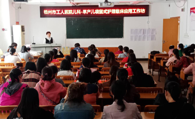 本次培训是梧州市儿科护理专业委员会在全市的学术交流中首次以工作坊形式开展。我院新生儿护理专科小组在此次工作坊的课程设计中,安排的第1学时理论授课主要帮助学员们掌握KMC理论知识,其后3个学时用以帮助护理人员通过现场的观摩与体验学习达到学习目标。