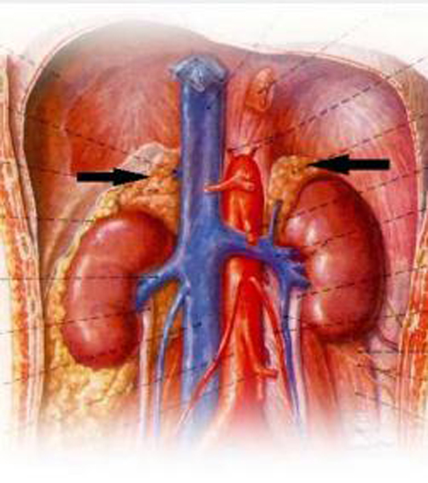 (肾上腺人体解剖图,图示黑色箭头)