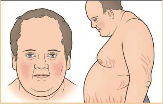 肾上腺分泌糖皮质激素以调节糖和蛋白质代谢的激素 ,以皮质醇为代表。皮质醇症多由肾上腺皮质增生或肿瘤分泌过量的皮质醇激素引起,表现为满月脸、水牛背、中心性肥胖,而四肢瘦,多血质和紫纹;疲倦、衰竭、腰背痛;高血压;多毛、脱发、痤疮;性功能障碍,闭经或月经减少。