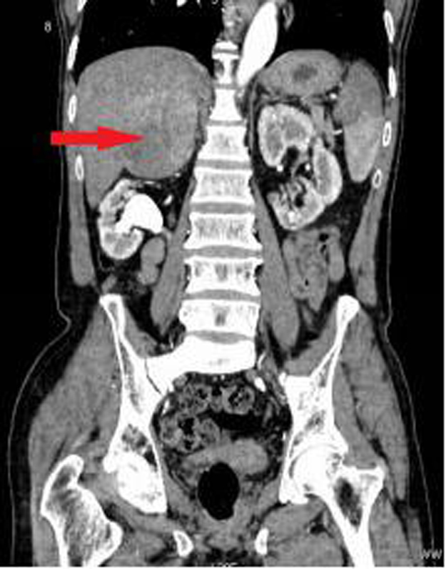 (右侧肾上腺肿瘤CT图示,红色箭头)