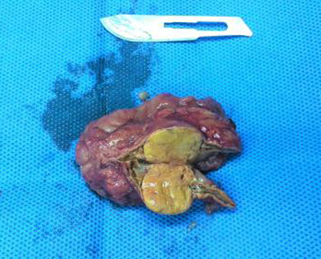 (图中金黄色的即为肾上腺肿瘤,大小约1.5公分)