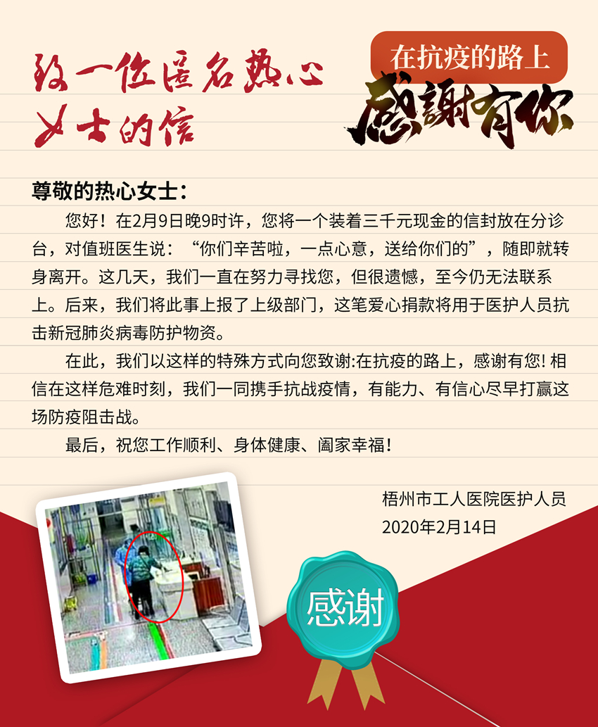 梧州市工人医院医务人员致一位匿名热心女士的信